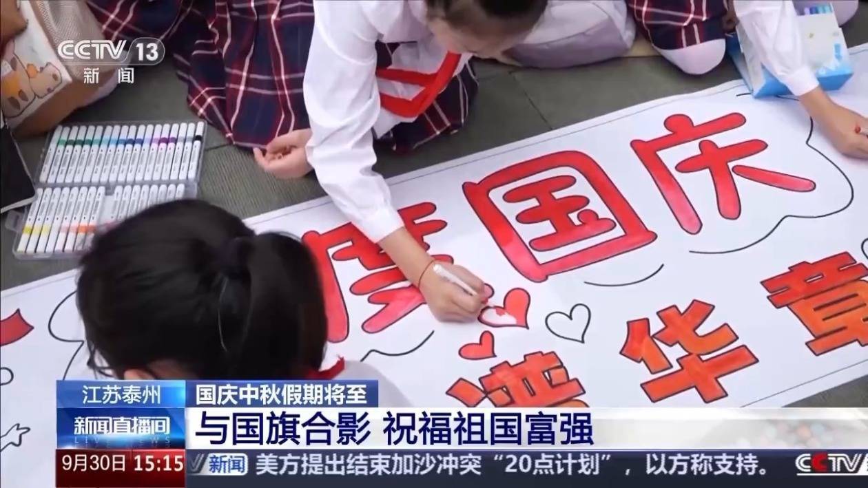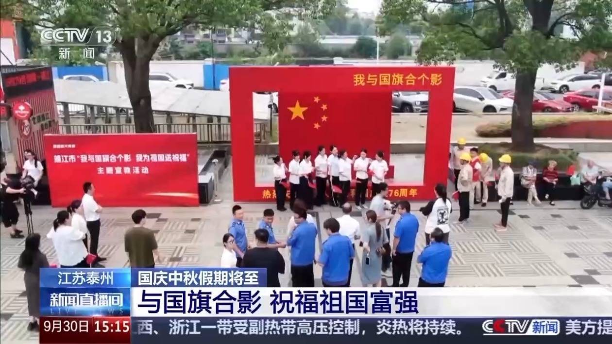 r为迎接国庆,这几天江苏泰州的主要道路、社区广场上都挂满了国旗。当地还启动了“我与国旗合个影”的打卡活动,吸引了许多市民游客参与。