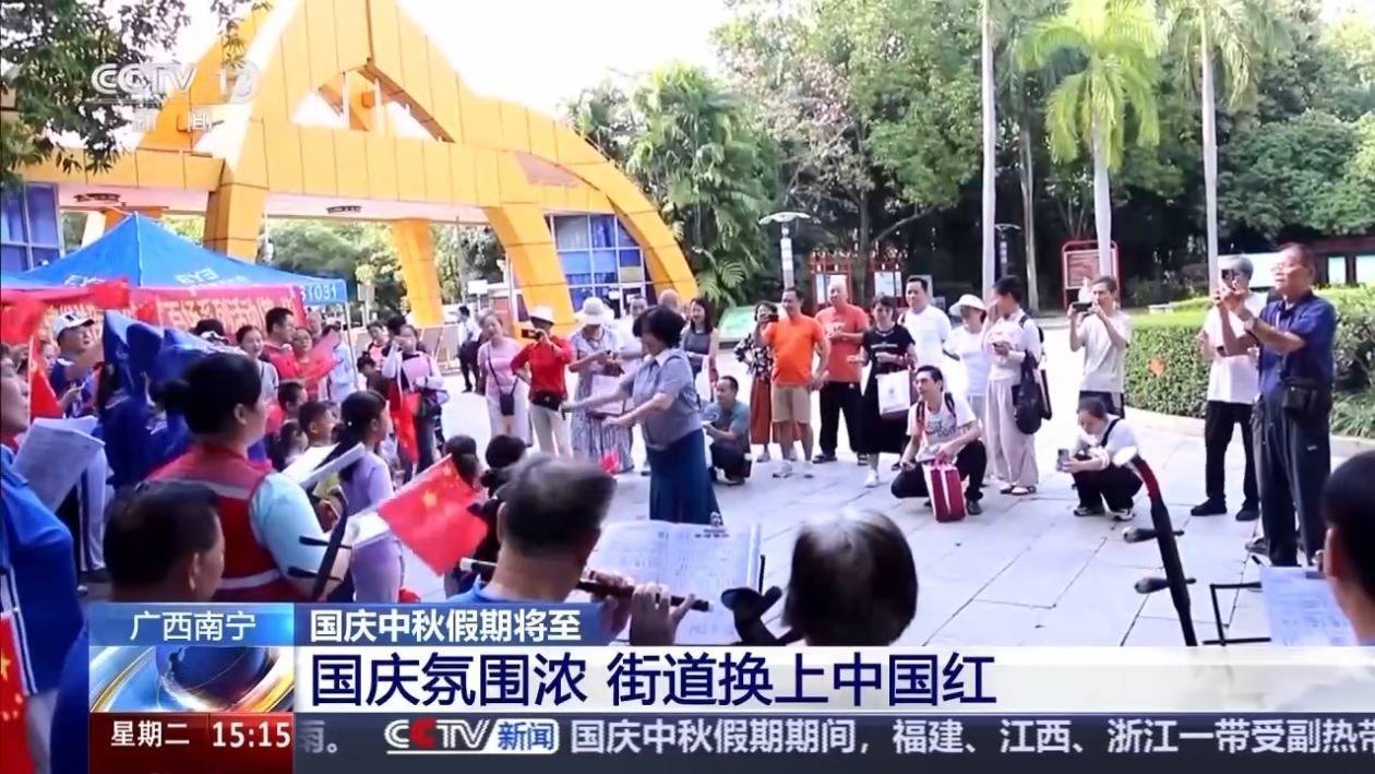 r国庆节临近,广西、江苏等地在城市道路、景区等区域挂上了国旗,营造出祥和的国庆氛围。
